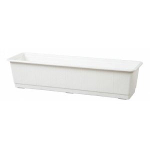 Plastový truhlík na květiny, pro lepší růst a snadnější zálivku se doporučuje provrtat dno pro odtok vody a kombinovat s miskou pod truhlík.