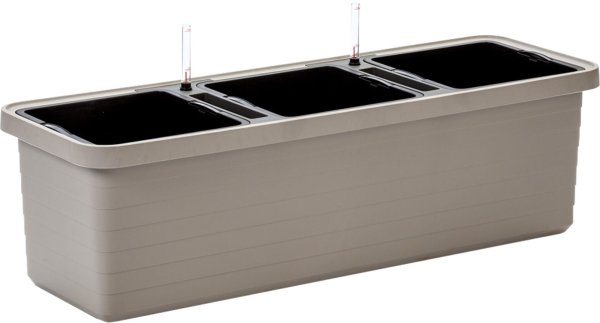Velkoobjemový samozavlažovací truhlík v moderním designu. Obsahuje 3 samostatně vyjímatelné nádoby. Skvěle se hodí pro pěstování zeleniny, květin, drobných keřů a bylin. Zalévání je bezstarostné - má velkou zásobárnu vody (27 l) s hladinoměrem, dostatečně velký otvor pro zalévání a přepad vody. Je vhodný na terasu, balkón a do zahrady. Příslušenství: 8 koleček, 3 knoty, 2 hladinoměry, 6 úchytů. Šířka: 120 cm, výška: 35 cm, hloubka: 39 cm. Rozměry jednotlivé nádoby: 33 x 33 cm, objem jednotlivé nádoby: 18 l. Barva: hnědo-šedá.