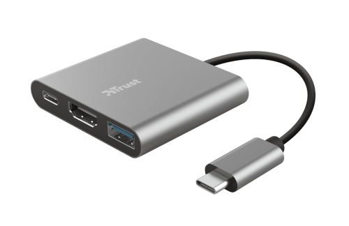 TRUST Dalyx 3-in-1 Multiport USB-C Adapter. Stylový hliníkový 3portový adaptér USB-C z hliníku pro přidání portů USB a HDMI a nabíjecího portu typu C do notebooku.