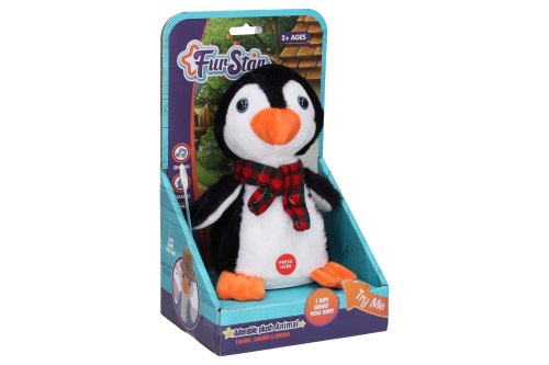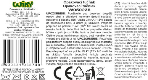 Tučňák opakuje co říkáš. Zvukové efekty, opakuje, tančí a zpívá. Rozměry 13x11x19 cm. Tlačítko na bříšku. 3xAAA baterie, součástí balení. Přepínač, OFF/TRY ME/PLAY.
