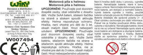 Motorová pila a přilba. Vydává zvukové efekty. Pilu nastartujete stisknutím tlačítka na straně. Následným stiskem spouště se rozjede řetěz a pila vydává realistické zvuky řezání. 3xAA baterie, součástí.