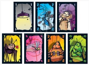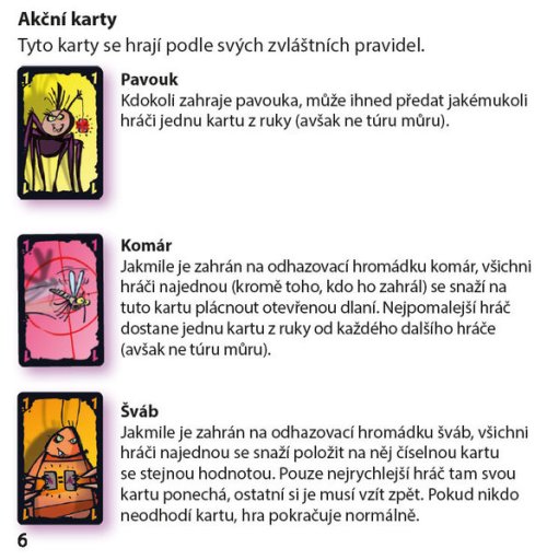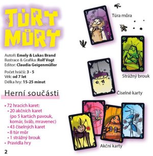 Hra obsahuje: 72 hracích karet - 20 akčních karet (pa 5 kartách pavouk, komár, šváb, mravenec) a 43 číselných karet 8 túr můr 1 strážného brouka 1 pravidla hry
