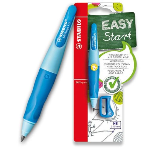 • inovativní, ergonomický design tužky speciálně navržený pro děti, které se učí psát, * tvarovaná zóna úchopu z příjemného protiskluzového materiálu, * stiskací mechanismus, * trendy barevné kombinace a jmenovka na každé tužce, * extra silná tuha tvrdosti HB (číslo 2) - průměr tuhy 3,15 mm, * vyměnitelná náplň, * součástí balení ergonomické ořezávátko v ergonomickém designu, [mechanická tužka 3,15 mm][pro leváky], Vyměnitelné extra silné HB tuhy. , Mechanická tužka STABILO EASYergo je doplněk rolleru STABILO EASYoriginal, který píše jako plnící pero.