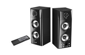 2.0 stereo reproduktory, připojení Bluetooth 5.0, 3,5mm audio jack, výkon 60 W, USB vstup, dálkové ovládání, široká kompatibilita, elegantní design v černé barvě.
