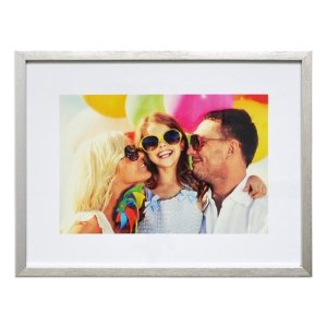 Vyrobeno z plastu Skleněný přední kryt, zadní strana z HDF desky Lze postavit nebo zavěsit (stojací podpěra a poutko) Rozměr: 100 x 150 mm Barva: stříbrná