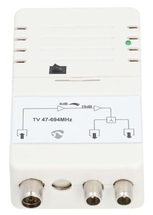 Dvoucestný vnitřní anténní zesilovač s 25 dB ziskem pro připojení dvou přijímačů.