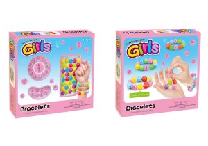 Tvorba náramků korálky. Obsahuje kolárky různých barev a růžové korálky s obrázky.