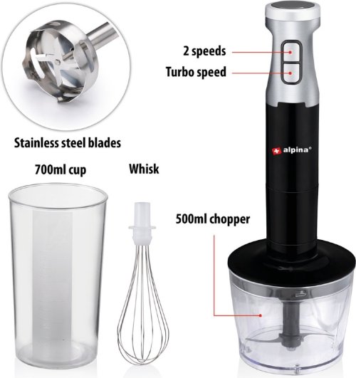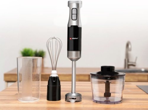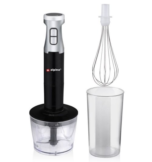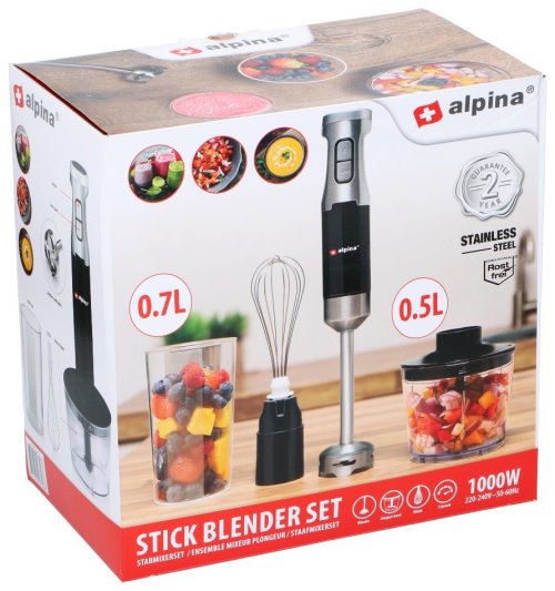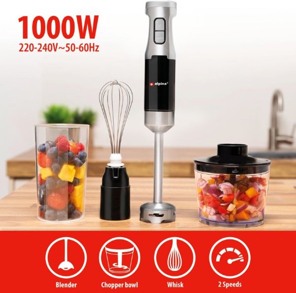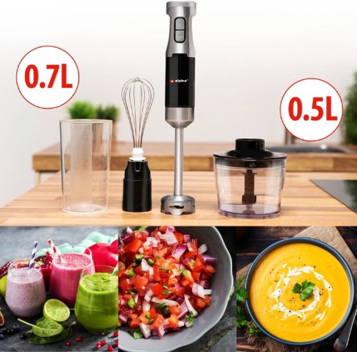 S tyčovým mixérem se sekáčkem Alpina bude vaření snadné a zábavné. Tento všestranný tyčový mixér je vaším dokonalým společníkem pro kulinářskou kreativitu. Mixér je dodáván s výkonným 500 mililitrovým sekáčkem, praktickou 700 mililitrovou odměrkou a nástavcem na šlehání, který vám umožní připravit širokou škálu pokrmů. Díky dvěma nastavením rychlosti a praktické funkci turbo nabízí tyčový mixér alpina přesné ovládání, které potřebujete pro každý recept. Ať už chcete připravit hedvábnou polévku, krémovou omáčku nebo lahodný dip, tento tyčový mixér poskytuje konzistentní výsledky pro každý kulinářský výtvor. Díky 90 centimetrů dlouhému napájecímu kabelu máte veškerou volnost pohybu, kterou v kuchyni potřebujete. Můžete bez námahy manévrovat a používat tyčový mixér se sekáčkem kdekoli a kdykoli budete chtít. Ať už jste kuchař začátečník nebo zkušený kuchař, tyčový mixér se sekáčkem Alpina je navržen tak, aby splnil všechny vaše kulinářské potřeby. Ergonomický design pohodlně padne do ruky a umožňuje dlouhodobé používání. Nerezový sekací nůž a šlehací nástavec jsou odolné a snadno se čistí, takže můžete strávit více času vařením a méně času uklízením.Specifikace alpina tyčový mixér se sekáčkemZnačka: alpinaMateriál: nerezová ocelBarva: černá/stříbrnáNapájení: 220-240V ~ 50-60HzPříkon: 1000W2 rychlosti a funkce turboVč. sekáček 500 mlVč. odměrka 700mlVč. šlehací nástavecDélka kabelu: 90 cm