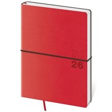 Moderní diář v měkké ohebné vazbě s kulatou příčnou gumičkou přes hřbet.