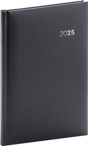 Plánovací týdenní diář Balacron 2025 formátu B5 v černém provedení, doplněný o stříbrný letopočet.
