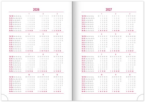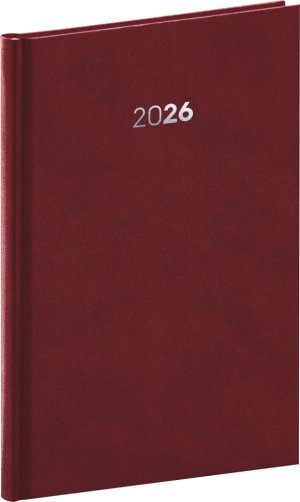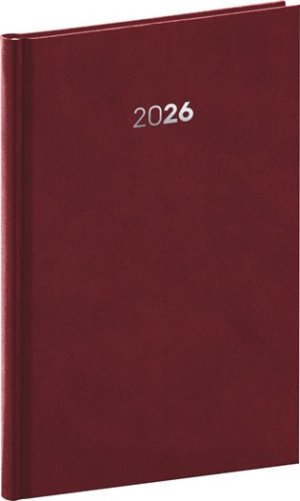 Plánovací týdenní diář Balakon 2026 v provedení bordó, doplněný o stříbrný letopočet. Povrch diáře si získal oblibu díky kvalitnímu svrchnímu materiálu, který je extrémně odolný vůči vnějšímu poškození. Týdenní rozvrh s česko-slovenským kalendáriem a doplňkovou angličtinou, němčinou, maďarštinou a ruštinou.