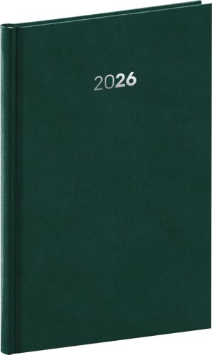Plánovací týdenní diář Balakon 2026 v zeleném provedení, doplněný o stříbrný letopočet. Povrch diáře si získal oblibu díky kvalitnímu svrchnímu materiálu, který je extrémně odolný vůči vnějšímu poškození. Týdenní rozvrh s česko-slovenským kalendáriem a doplňkovou angličtinou, němčinou, maďarštinou a ruštinou.