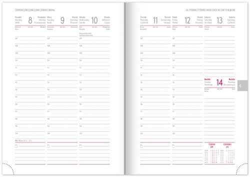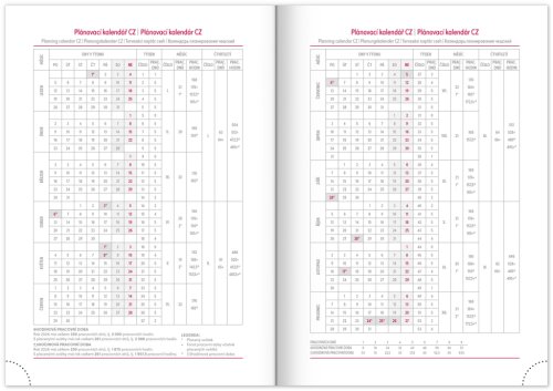 Týdenní diář Tomy 2026 v modro-červené barvě. Klasický povrch imitující kůži, který doplňuje jemné prošití. Na materiál lze tisknout a je vhodný pro všechny typy ražeb. Týdenní rozvrh s česko-slovenským kalendáriem a doplňkovou angličtinou, němčinou, maďarštinou a ruštinou.