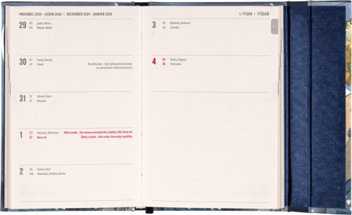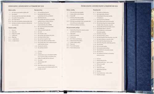 Týdenní diář s praktickým magnetickým uzavíráním je ideální volbou pro ty, kteří chtějí mít své plány přehledně pod kontrolou. Horizontální rozložení s českým a slovenským kalendáriem ve verzi týden na dvou stranách s prostorem pro poznámky. Součástí jsou praktické měsíční přehledy, ideální pro plánování dovolených či prázdnin, a také seznam českých a slovenských svátků a jmenin.