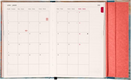 Týdenní diář s praktickým magnetickým uzavíráním je ideální volbou pro ty, kteří chtějí mít své plány přehledně pod kontrolou. Horizontální rozložení s českým a slovenským kalendáriem ve verzi týden na dvou stranách s prostorem pro poznámky. Součástí jsou praktické měsíční přehledy, ideální pro plánování dovolených či prázdnin, a také seznam českých a slovenských svátků a jmenin.