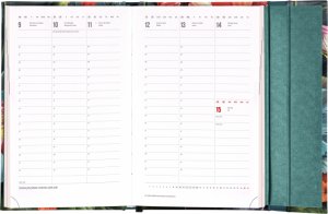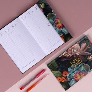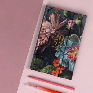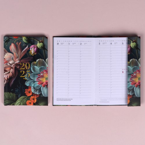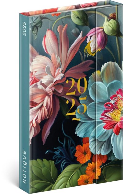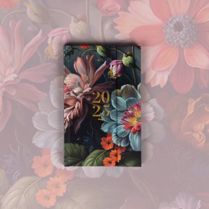 Šestijazyčný týdenní diář s magnetickým uzavíráním obsahuje přehled mezinárodních svátků, seznam českých a slovenských jmen, přehled roku 2025 a 2026, dodatečné stránky na poznámky a kapsičku na zadní předsádce. Sloupcové rozvržení s prostorem pro poznámky na každý den. Diář je v designu s motivem květin.