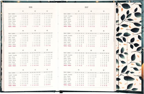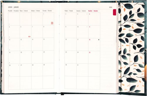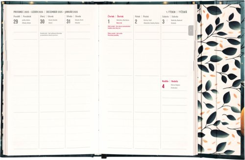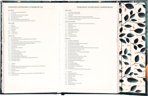 Týdenní diář s praktickým magnetickým uzavíráním je ideální volbou pro ty, kteří chtějí mít své plány přehledně pod kontrolou. Nabízí sloupcové rozvržení jednotlivých týdnů s dostatkem prostoru pro každodenní poznámky. Součástí jsou praktické měsíční přehledy, ideální pro plánování dovolených či prázdnin, a také seznam českých a slovenských svátků a jmenin.