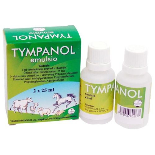 Tympanol je přípravek s obsahem polydimetylsiloxanu, aktivovaného koloidním oxidem křemičitým ve formě emulze jako účinný prostředek při plynatosti a jako odpěnovací prostředek, založený na rozrušování pěny ovlivňováním povrchového napětí. Způsobuje splývání plynových bublinek a ulehčuje tak odchod plynů. Bílá až slabě nažloutlá, lehce roztřepatelná emulze. Oblast použití: Všechny stavy provázené nadměrným hromaděním plynů v trávicím traktu: