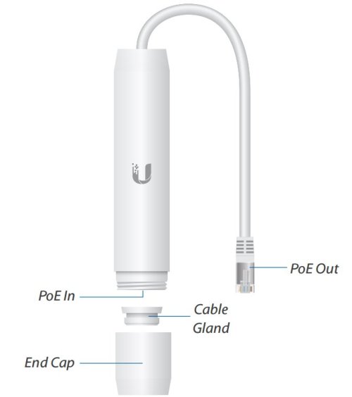 Venkovní PoE extraktor pro napájení většiny RouterBOARDů nebo zařízení od Ubiquiti s gigabitovým portem. Jedná se o převodník z aktivního napájení označeného jako 802.3af na pasivní PoE 24V/0,5A s maximální zátěží 12W.