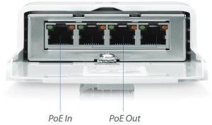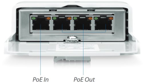 POE napájení Switch má celkem 4 porty z čehož 1. port je určen pro vstupní napájení pomocí 24V pasivního Gigabitového napájecího PoE adaptéru s podporou napájení po 2 párech. Zbylé 3 porty slouží pro napájení dalších zařízení s podporou 24V pasivního Gigabit PoE s podporou napájení po 2 párech (standard pro zařízení typu NanoStation, PowerBeam, AirGrid atd.). Maximální spotřeba na port je 24W, celková spotřeba všech 3 PoE portů je max. 24W.