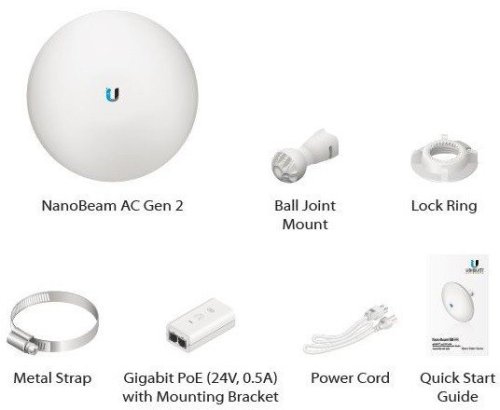 NanoBeam (NBE-5AC-Gen2) je kompletní venkovní jednotka druhé generace s 19 dBi MIMO 2x2 anténami pro pásmo 5 GHz vhodná jako klientská jednotka. NanoBeam podporuje normu 802.3ac, díky tomu dosahuje propustnosti až 450 Mbps.