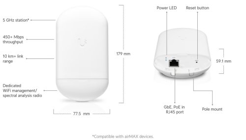 NanoStation 5AC Loco je velmi malá klientská 13dBi stanice řady airMAX ac, která dosahuje velice vysokých přenosových rychlostí a stabilního spojení i v zarušeném prostředí. Jednotka je kompatibilní jen s dalšími produkty airMAX ac a je určena pro venkovní použití. Díky možnému nastavení šířky kanálu 10/20/30/40/50/60 a 80MHz lze při modulaci 256QAM dosáhnout reálné propustnosti až 450Mb/s+.
