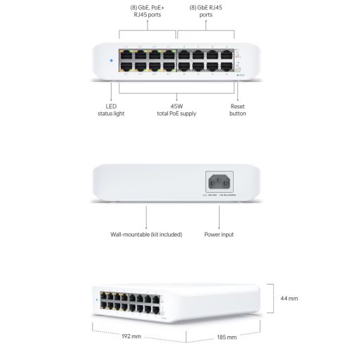 USW-Lite-16-PoE je Gigabitový PoE L2 Switch od Ubiquiti Networks v desktop provedení s maximálním PoE budgetem 45W.