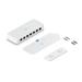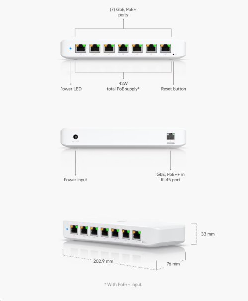 Klíčové vlastnosti Počet portů: 7× GbE RJ-45 PoE+ výstup (802.3at) 1× GbE RJ-45 PoE++ vstup (802.3bt) PoE budget: 42 W při napájení přes PoE++ 16 W při napájení přes PoE+ 52 W při napájení přes 60 W DC adaptér (není součástí balení) 202 W při napájení přes 210 W DC adaptér (není součástí balení) Kapacita switche: 16 Gbps Neblokující propustnost: 8 Gbps Možnosti montáže: Možnost montáže na stěnu (montážní sada je součástí balení) Rozměry: 203 × 76 × 33 mm Hmotnost: 320 g