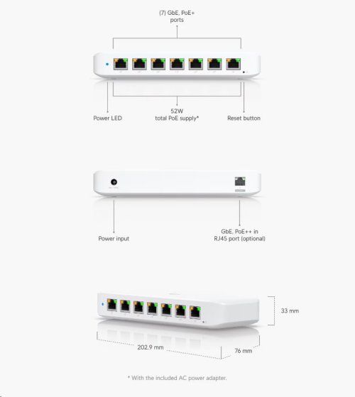 Kompaktní 8 portový gigabitový PoE switch. Switch disponuje 1 PoE in portem a 7 PoE out porty s podporou PoE napájení 802.3af/at s maximálním zatížením až 30W na port. Switch je spravován pomocí aplikace UniFi network umožňující centrální správu Vaší sítě včetně cloudového přístupu.