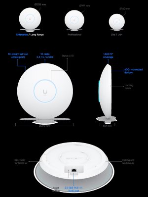 UniFi Access Point WiFi 6 Enterprise je vysoce výkonný triple-band WiFi 6/6E přístupový bod (2,4GHz, 5GHz a 6GHz) a je ideální AP do velmi vytížených míst jako jsou haly, sklady či kanceláře.