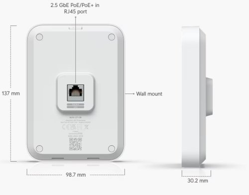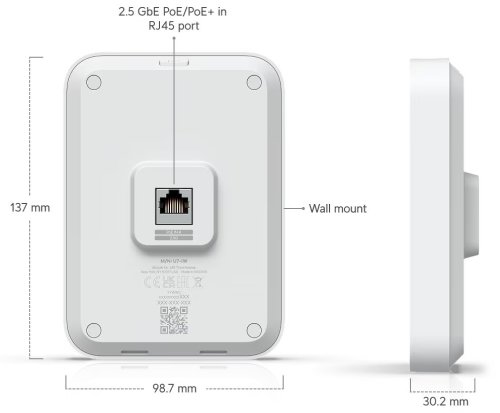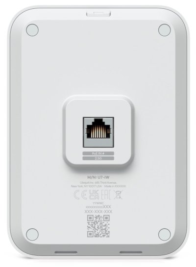 Nástěnná jednotka Ubiquiti UniFi U7 In-Wall je kompaktní Wi-Fi 7 AP s podporou frekvenčních pásem 2,4 a 5 GHz a přenosovou rychlostí až 4,3 Gbps pro 5 GHz a 688 Mbps pro 2,4 GHz. Model U7 In-Wall disponuje čtyřmi datovými proudy, 2,5GbE uplinkem a dvěma 2,5GbE LAN porty, z nichž jeden podporuje PoE napájení.