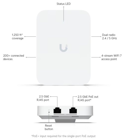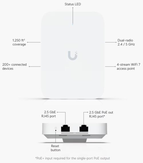 UniFi U7 In-Wall je designově povedené vnitřní hotspotové řešení využívající standard 802.11n/ac/ax/be. Je vybaveno anténním systémem MIMO 2×2 v podobě integrovaných antén se ziskem 4 dBi/ 8 dBi (2,4 GHz/ 5 GHz). Jednotka podporuje PoE/PoE+ napájení.