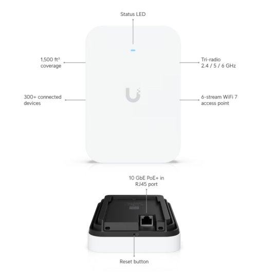 Přehled *Rozměry: 155 × 108 × 33,5 mm *Wi-Fi standard: Wi-Fi 7 (802.11be) *Počet prostorových streamů: 6 *Pokrytí: až 140 m2 *Max. počet klientů: 300+ *Uplink: 10 GbE *Montáž: na zeď *Napájení: PoE+