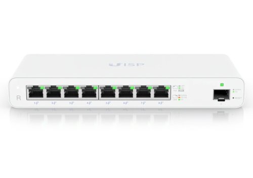 Ubiquiti UISP Router UISP Router je osazen osmi GbE PoE RJ-45 a jedním GbE SFP slotem pro uplink. Celková napájecí PoE kapacita je 110W. Router lze navíc upevnit ke zdi, díky přiloženému držáku.