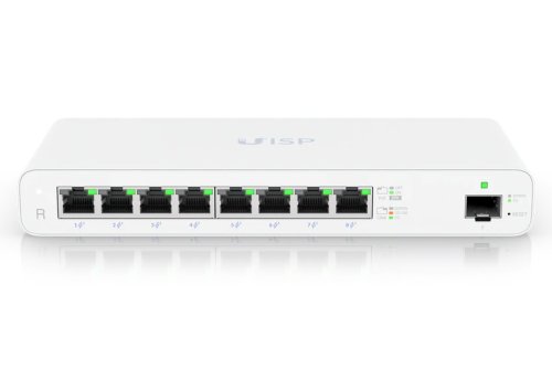 UISP Router je osazen osmi GbE PoE RJ-45 a jedním GbE SFP slotem pro uplink. Celková napájecí PoE kapacita je 110 W. Router lze navíc upevnit ke zdi, díky přiloženému držáku.