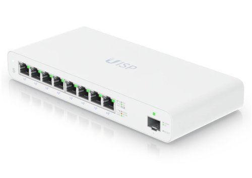 Ubiquiti UISP Switch UISP Switch je osazen osmi GbE PoE RJ-45 a jedním GbE SFP slotem pro uplink. Jedná se o bezventilátorový L2 přepínač s kapacitou 18Gbps a rychlostí směrování 13,392Mpps. Celková napájecí PoE kapacita switche je 110W. Switch lze navíc upevnit ke zdi, díky přiloženému držáku.