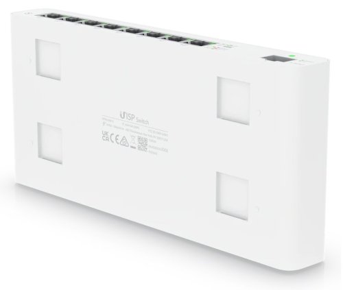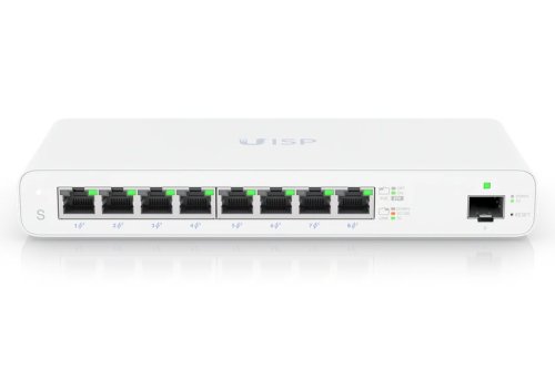 UISP Switch je osazen osmi GbE PoE RJ-45 a jedním GbE SFP slotem pro uplink. Jedná se o bezventilátorový L2 přepínač s kapacitou 18 Gbps a rychlostí směrování 13,392 Mpps. Celková napájecí PoE kapacita switche je 110 W. Switch lze navíc upevnit ke zdi, díky přiloženému držáku.