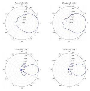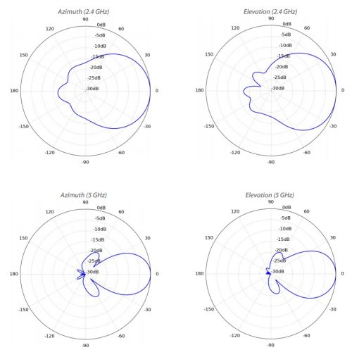 Vyzařovací úhel antény v pásmu 2,4 GHz je 90° (10 dBi) a v pásmu 5 GHz 45° (15 dBi).