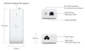 Rozhraní: Wi-Fi (5 GHz, 802.11a/n/ac), 1× GbE RJ-45 PoE výstup, 1× RP-SMA konektor