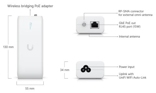 PoE adaptér pro bezdrátové přemostění typu plug-and-play s integrovanou funkcí UniFi WiFi Auto-Link. Kompatibilní s kamerami UniFi Protect PoE, telefony Talk a různými zařízeními IoT prostřednictvím ethernetového připojení.