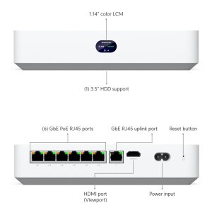 UniFi Protect NVR určený pro malé až střední instalace kombinuje funkce síťového video rekordéru s 6portovým Gigabit PoE switchem (40W budget) a integrovaným HDMI Viewport pro živé sledování kamer. Podporuje až 15 Full HD, 8 2K nebo 6 4K kamer a umožňuje také správu až 50 UniFi Access hubů pro kontrolu přístupu.