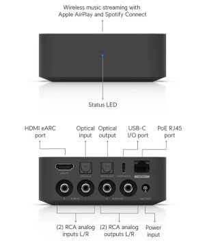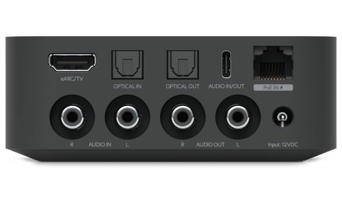 PoE Audio Port nabízí komplexní možnosti připojení včetně analogových RCA vstupů/výstupů, HDMI eARC, optického vstupu/výstupu a univerzálního USB-C portu. Můžete tak připojit CD přehrávač, gramofon nebo jiný zdroj zvuku a streamovat audio do dalších místností, nebo naopak využít výstupy pro připojení aktivních reproduktorů či externích zesilovačů.