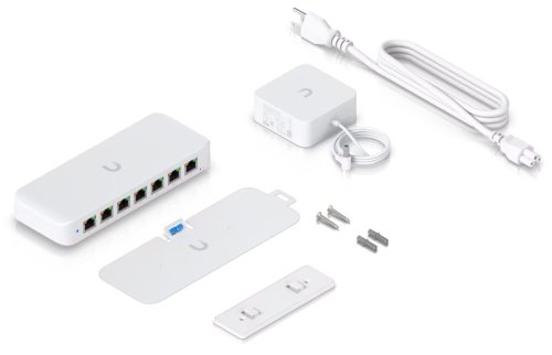 UniFi Switch Ultra je osazen sedmi výstupními GbE PoE+ RJ-45 porty a jedním vstupním GbE PoE++ RJ-45 portem. Jedná se o L2 switch s celkovou kapacitou 16 Gbps, neblokovanou propustností 8 Gbps a PoE budgetem až 202 W (v závislosti na typu napájení). Switch lze napájet buď přes DC konektor (54 V DC), nebo přes PoE++ (802.3at/bt) vstup na zadní straně. Díky přiloženému držáku jej lze snadno upevnit na stěnu.