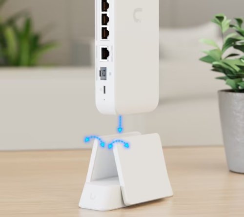 Zatížený stojan s nastavitelnou svorkou udržuje zařízení UniFi ve vzpřímené poloze na rovném povrchu.