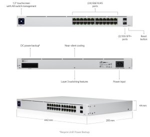 USW-Pro-24 je managovatelný Gigabitový L3 switch s 24x Gigabit LAN porty a dvěma porty SFP+ s přenosovou rychlostí 1/10Gbps. Switch má kromě standardní výbavy také 1,3" dotykový displej pro poskytování informací o systému, teplotě, statistice portů a mnoho dalšího.
