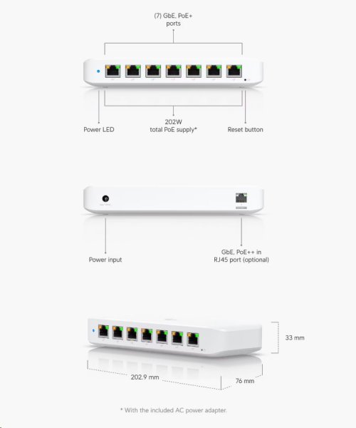 Technické parametry Rozhraní pro správu: Ethernet In-Band Síťové rozhraní: 8x GbE RJ45 PoE rozhraní: