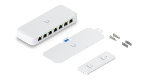 UniFi Switch Ultra je osazen sedmi výstupními GbE PoE+ RJ-45 porty a jedním vstupním GbE PoE++ RJ-45 portem. Jedná se o L2 switch s celkovou kapacitou 16 Gbps, neblokovanou propustností 8 Gbps a PoE budgetem až 202 W (v závislosti na typu napájení). Switch lze napájet buď přes DC konektor (54 V DC), nebo přes PoE++ (802.3at/bt) vstup na zadní straně. Díky přiloženému držáku jej lze snadno upevnit na stěnu.