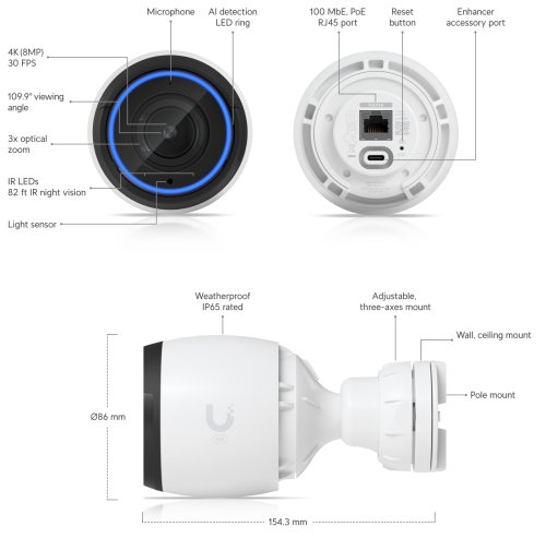 *Rozlišení videa 4K (8 MP) *3x optický zoom *Noční vidění v infračerveném spektru na 25 m *Detekce událostí s umělou inteligencí *Vestavěné IR LED diody a automatický IR cut filtrem *Záznam zvuku pomocí integrovaného mikrofonu *Připojení a napájení pomocí PoE *Volitelný Enhancer pro integrovaný reflektor a rozšířené IR záření *Odolnost vůči povětrnostním vlivům (vystaveno venkovním podmínkám)