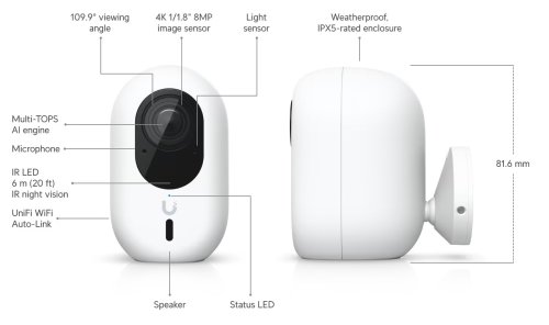 Technické specifikace Rozměry: 81,7 × 50,1 × 57,2 mm IR noční vidění: 6 m Rozpoznávání tváře: Ano Rozpoznávání registračních značek: Ano Chytrá detekce (lidé, vozidla, zvířata): Ano Rozlišení: 4K Zorné pole: H: 109,9°, V: 56,7°, D: 134,1° Audio: Obousměrný zvuk Odolnost vůči povětrnostním vlivům: IPX5 Odolnost proti neoprávněné manipulaci: IK04 Montáž: Příslušenství pro montáž na zeď