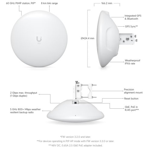 Může se připojit k Wave AP a poskytovat celkovou propustnost 2Gbps (1Gbps duplex). Wave Long-Range je vybaven vysoce výkonným 5GHz záložním pásmem, které zajišťuje nepřerušované připojení, a Bluetooth pro zjednodušení nastavení prostřednictvím aplikace UISP® Mobile.